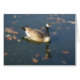 Este mango canadiense nada a través del agua llena de hojas de roble otoñales. Una reflexión se muestra en el agua de abajo.