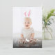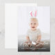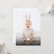Esta adorable tarjeta de fotografía de Pascua personalizable presenta tu foto personalizada como fondo con orejas de conejo rosadas y blancas superpuestas en la parte superior. Las orejas son móviles y se pueden cambiar de tamaño o reposicionar utilizando las herramientas de edición de Zazzle, así que asegúrate de ajustarlas para que se ajusten a tu foto, ya que no se colocarán automáticamente.