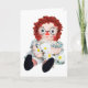 Vieja muñeca de trapo con margaritas blancas y anteojos negros sobre fondo blanco.