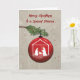 Enviar Navidades a un diácono especial. Un adorno rojo representa a María, José y el niño Jesús en una silueta blanca. El fondo de madera adorna el santo adorno colgado de una rama verde. Bonita tarjeta para enviar bendiciones a un diácono.