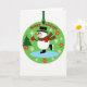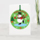 ¡Difundan alegría por las vacaciones con esta célebre y encantadora tarjeta de Navidades! 🎅 🏼 🎄 Imagina recibir un adorno redondo, verde lima adornado con un alegre snowman patinando sobre una rosa azul claro. El muñeco de nieve luce un sombrero negro superior, una bufanda rayada roja y verde, y mitones, todo acompañado de una sonrisa brillante. Esta adorable escena se sitúa en un telón de fondo de copos de nieve blancos, estrellas rojas y un pequeño árbol de Navidad. Las palabras "Felices Fiestas" con letras rojas y verdes unen todo. Perfecto para agregar un toque de alegría a cualquier árbol de Navidad familiar o etiqueta de regalo, esta tarjeta seguramente traerá sonrisas por todas partes.