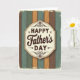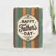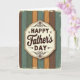 This design shows a cream-toned decorative plaque centered like a vintage sign, lifted slightly by a soft shadow that adds depth. Its curving, shield-like shape frames the words “HAPPY Father’s DAY,” with “HAPPY” and “DAY” in sturdy serif capitals and “Father’s” in a flowing cursive style. The lettering appears in warm brown, and a thinner, darker brown outline traces the plaque’s edge to make it stand out. Small scroll accents and tiny star-like marks sit near the top and bottom, giving the sign a gentle, affectionate touch that feels like a quiet nod between loved ones 👨. Behind it, vertical wooden planks form the setting in muted teal, golden ochre, and deep brown, with visible grain lines and worn streaks that suggest years of shared projects 🛠️. A roughened, distressed border surrounds the whole design like softened, timeworn paint along the edges. The plaque stays centered against the striped boards, with the brown text clearly readable on the light background and the decorative flourishes balanced above and below.