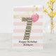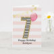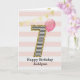 Tarjeta de cumpleaños número 7 de color dorado y rosa para niñas, que se puede personalizar con su nombre. La parte frontal de esta hermosa tarjeta de cumpleaños número 6 para ella presenta el número siete en una franja negra y blanca con un contorno brillante con un globo rosa listo para flotar. Tenga en cuenta que el brillo es un efecto de diseño y no habrá brillo real en esta tarjeta de cumpleaños. El fondo es blanco suave y rosa con un banner dorado en la parte superior. El mensaje interior se puede personalizar fácilmente si lo desea. Una tarjeta de cumpleaños número 7 única para nieta, hija, sobrina, etc.