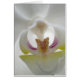 Tarjeta con asombroso cierre de una flor de orquídea blanca con el interior amarillo y rosa