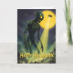 Tarjeta de Halloween con un invasor extranjero que viene a tomar el planeta y asustar la ciudad. Una nave espacial está lanzando un rayo de misteriosa luz sobre la ciudad. Añade tu mensaje dentro del mismo tipo de letra espeluznante.
