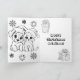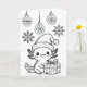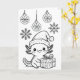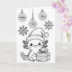 Una tarjeta de Navidad personalizada con una página para colorear un axolotl. Otros elementos divertidos para colorear también, como un cachorro y un gato y regalos.