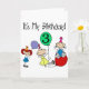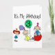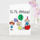 Tres chicas de palos en gorras fiestas con globos, uno con un número 3 en ella, y un texto de estilo infantil que dice "¡Es mi cumpleaños!" aparece en este diseño de 3er cumpleaños.