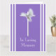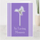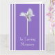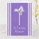 Un diseño sobrio, elegante y espiritual de una paloma blanca en vuelo con una gran cruz blanca detrás y pequeñas estrellas dispersas sobre un fondo morado. Los bordes izquierdo y derecho de la tarjeta tienen tres franjas verticales blancas y las palabras "En memoria amorosa" aparecen debajo del pájaro. Personalice el color del fondo y cambie la redacción y el poema a cualquiera de sus opciones personales. Adecuado para las mujeres. El poema de adentro dice Quizás no son las estrellas, sino las aberturas en el Cielo donde el amor de nuestros perdidos avanza y nos reluce para hacernos saber que son felices.
