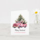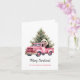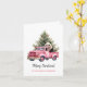Panda en tarjeta de felicitación de Navidades de camioneta rosa Vintage. Dibujo acuarela de oso panda blanco en un camión de cosecha rosa y árboles navideños con baudias rosas. Texto personalizado.