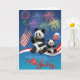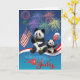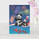 Una panda del bebé soporta los globos patrióticos como celebra por su primera vez, a adelante del Día de la Independencia de julio mientras que la panda adulta agita la bandera americana contra un fondo de fuegos artificiales.