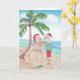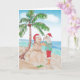 Pintura en acuarela de Papá Noel con una camisa playera llena de flamencos construyendo un muñeco de nieve con arena en la playa. Ideal para personas que viven en Florida o cualquier comunidad costera. Tarjeta divertida de Feliz Navidad para amantes de la playa.