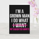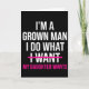 ¡Celebra el Día del Padre con risas! Esta tarjeta de “Soy un hombre adulto, hago lo que mi hija quiere” es el regalo divertido perfecto para padres que abrazan orgullosamente su papel de papá de una niña. Con tipografía destrozada en negrita y una línea tachada juguetona para agregar humor extra, este diseño es un regalo ideal de hijas para el Día del Padre, cumpleaños o cualquier ocasión especial. Ideal para padres que aman los chistes, el humor familiar y los regalos sentimentales con personalidad.