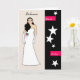 Esta tarjeta especial de felicitación tiene un dibujo de una joven con un vestido largo y blanco, guantes blancos, pelo largo negro y una flor rosa en el vestido por la cintura. En la parte delantera hay un gran borde negro con estrellas y bares rosas. Las palabras Debutante y You are a Star están en la parte delantera de la tarjeta. El interior es en parte una tarjeta de dinero. Gracias a All Silhouetts por el contorno de la joven.