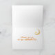 Una elegante tarjeta de bienvenida para tu amigo, con un contorno de letras decorativas con efecto oro y lleno de patrones islámicos de colores brillantes. El saludo de portada es: 'Eid Mubarak. ¡a mi querido amigo!' Hay una linterna de colores vivos en la esquina inferior izquierda, colgando debajo de la letra "E" y una luna estampada y una estrella en la esquina superior derecha, con dos farolillos más y una estrella islámica suspendida de la luna. El fondo blanco de la portada está ligeramente texturado y el mensaje interior es sólo una sugerencia que puede cambiar o borrar fácilmente si lo desea.