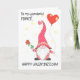 Una divertida tarjeta El día de San Valentín de saludo para un novio, con un lindo gnomo, vestido de rojo, sosteniendo una sola rosa roja en una mano y un globo rojo con forma de corazón en la otra. Este popular gnomo al estilo escandinavo es pequeño y regordete, con una enorme barba blanca que llega al suelo y un alto gorra que le bajan los ojos para que todo lo que podemos ver de su cara sea su nariz grande y rosa. Hay un corazón decorativo colgando de la punta de su gorra y su banda de color dorado tiene X rojas para besos alrededor. El saludo de portada, con una letra negra y divertida, es: "¡A mi maravilloso FIANZA, FELIZ DÍA DE VALENTINE!" El fondo es blanco, con una dispersión de pequeños corazones dorados pálidos. El mensaje interior es sólo una sugerencia y puede cambiarlo o borrarlo por completo si está buscando una tarjeta "interior en blanco".