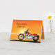Una moto similar a una Harley que se alza junto al mar con una gloriosa puesta de sol naranja. Una gran carta para cualquiera que le guste el ciclismo y las motocicletas. Vea toda la gama de tarjetas para edades y relaciones en mi tienda. Todos los derechos de autor de arte Norma Cornes