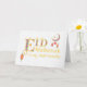 Una elegante tarjeta de felicitación para tus padres, con un contorno de letras decorativas de efecto dorado y lleno de motivos islámicos de colores vivos. El saludo de la portada es "Eid Mubarak. a mis queridos padres". Hay una linterna de colores vivos en la esquina inferior izquierda, colgando debajo de la letra "E" y una luna estampada y una estrella en la esquina superior derecha, con dos farolillos más y una estrella islámica suspendida de la luna. El fondo blanco de la portada está ligeramente texturado y el mensaje interior es sólo una sugerencia que puede cambiar o borrar fácilmente si lo desea.