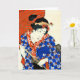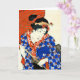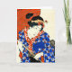Una joven mujer con un kimono de cuadros azules, adornos de pelo y una sombrilla roja. De un original corte de madera del siglo XIX (1843), 'Nagauta no Keiko ni Kayou Shojo' (yendo a las lecciones de Nagauta), de Ikeda Eisen. Todos los derechos reservados © 2013 padre art