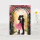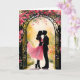 Las siluetas de una pareja besándose bajo un arco cubierto de flores en un jardín crean una dulce y romántica tarjeta de San Valentín para tu amor.