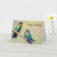 Tarjeta de feliz cumpleaños que presenta dos colibríes de garganta ardiente verdes, naranjas y amarillos posados juntos, uno con el pico abierto como si hablara con el otro. Un bonito saludo de cumpleaños para una pareja, amigo o amante de los colibríes. Foto tomada en Paraiso Quetzal Lodge, San Gerardo de Dota, Costa Rica.