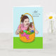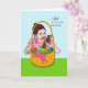 Tarjeta Pascua divertida con mujer comiendo conejo de choc