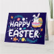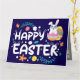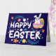 Tarjeta Pascua feliz, huevos, conejo y flores