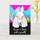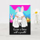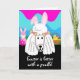 Pascua es mejor con un Poodle, tarjeta de saludo de papel con un caniche blanco sobre negro con huevo de Pascua, conejo de Pascua, hierba verde, orejas de conejito y fondo ondulado colorido. Arte, imagen y verso copyright © Shoaff Ballanger Studios, 2022.