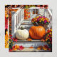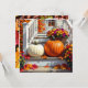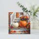 Una encantadora tarjeta personalizada de Acción de Gracias llena de coloridas hojas de otoño y calabazas sentadas en la escalera delantera de una casa de campo. Puedes personalizar tu mensaje de Acción de Gracias en la parte posterior del área de personalización.