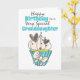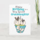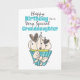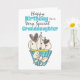 Un hermoso ilustracion de un quequito caprichoso a mano pintado en azul oscuro, naranja pastel y gris, que tiene escarcha, espolvorines y corazones bonitos. Las palabras, feliz cumpleaños de una nieta muy especial (que puede cambiarse a hija, sobrina, ahijado, etc) aparecen en un fondo blanco. El interior tiene un precioso mensaje de tierno que debería ser personalizado para adaptarse a cualquier relación familiar que haya insertado en el frente.
