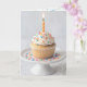Una sola magdalena de vainilla coronada con glaseado en espiral y grageas coloridas, con una vela rayada encendida sobre un plato de pedestal con encaje blanco. El texto interior es editable.