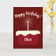 Esta carta de cumpleaños incluye un pastel de terciopelo rojo con helado de queso crema, coronado con una única vela de cumpleaños a rayas rojas con el nombre de la persona de cumpleaños escrito en cursiva al lado del pastel en un color de helado a juego. Encima de la tarta de cumpleaños está "¡Feliz cumpleaños!" o el texto de su personalizado. También puedes personalizar el mensaje de cumpleaños en el interior de la tarjeta.