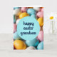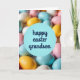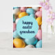 This card shows a close-up cluster of pastel, egg-shaped candies filling the scene, with soft blues, tender pinks, creamy whites, and sunlit yellows blending together like a gentle spring backdrop 🌷. A calm, round blue circle sits in the center foreground, standing out against the busy scatter of sweets behind it. Across that circle, the words “happy easter grandson” are placed prominently in deep indigo lettering, centered and easy to read. The smooth candy surfaces catch little highlights, giving them a sugary sheen that feels sweet and inviting. The background fades slightly out of focus, so your eyes land on the greeting first and then drift into the cozy color field behind it. The close framing and soft blur create a tender, affectionate feel, like a warm note shared between close family members 🐰. The blue circle looks crisp against the pastel eggs, with the indigo text sitting neatly across the middle. Around it, the softly blurred eggs form a dense ring of pale color with tiny glints of reflected light.