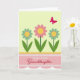 This card features a calm pale yellow-green background that feels like early spring, with three stylized flowers standing together like close friends 🌷. Two matching blooms sit on the left and right with rounded teal petals and sunny yellow centers, while the middle flower adds a gentle romantic touch with soft pink petals around its yellow center. The flowers rise on slim green stems, and broad green leaves at the base make them look grounded and steady, as if leaning in toward one another. In the upper right, a magenta butterfly hovers nearby 🐇, adding a lively contrast that suggests a sweet, fluttery moment. Across the lower third, a soft pink horizontal band stretches from side to side, edged with fine white lace-like borders. The greeting text sits inside this band, with “Happy Easter” in a simple dark lettering and “Granddaughter” in a flowing darker style placed beside or just below it. The lace edge shows tiny repeating loops and petal-like cutouts along the top and bottom of the pink band.