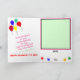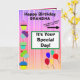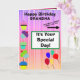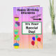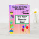 Feliz cumpleaños GRANDMA está escrito en tipografía negra contra tonos de rayas púrpuras, rosas, naranjas, amarillas y oscuras. Globos coloridos y quequitos decorados con vainilla y chocolate con cerezas y velas. Es su día especial está escrito contra rectángulo geométrico blanco y verde salado claro. En la izquierda hay deseos de cumpleaños para GRANDMA en tipografía rosa y roja y globos voladores. En el interior de la derecha hay un área con marcos rosados y negros con fondo verde sabio para que el niño escriba a mano su pequeño mensaje o haga un dibujo. Obra de arte y diseño originales © TamiraZDesigns.