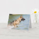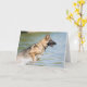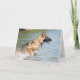Un emocionado perro pastor alemán salta al agua al aire libre en un día soleado.