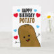 Patata marrón feliz divertida rodeada de corazones de amor rojos y azules con papa de cumpleaños feliz con letras negras y marrones encima de su cabeza. Dentro hay una plantilla que puede usar tal como está, reemplazar por su propio mensaje de cumpleaños o borrar para dejar en blanco.
