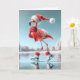 Un flamingo con sombrero de Santa y una bufanda se desliza grácilmente sobre patines de hielo a lo largo de un lago congelado