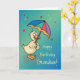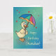 Una tarjeta deliciosa para desearle a su nieto un feliz cumpleaños. ¡Háganle saber lo que es un pato afortunado que es que es amado mientras le llueven abrazos y besos y deseos de cumpleaños! Un lindo pato sostiene un paraguas mientras gotas de lluvia y corazones rojos caen a su alrededor. El azul y el verde le dan encanto a la tarjeta.