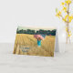 Joven chica corriendo en un campo de trigo con bandera estadounidense. La tarjeta se puede usar para el cumpleaños, el Día de los Veteranos o cualquier evento patriótico.