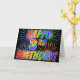 La parte delantera de este llamativo, emocionante y vibrante diseño de tarjetas de felicitación presenta un patrón colorido inspirado en fuegos artificiales de celebración, junto con el mensaje "¡FELIZ TERCER CUMPLEAÑOS!", con un patrón gradiente inspirado en el arcoiris multicolor, sobre un fondo de color negro. En el interior aparece un mensaje de saludo personalizado, o tal vez se pueda borrar y dejar en blanco si se va a escribir un mensaje a mano. Una tarjeta de felicitación como esta podría ser una manera feliz y divertida de celebrar el tercer cumpleaños de alguien. [~Z0000355]