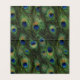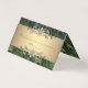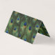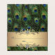 Tarjetas de lugar de boda de pavo real plegadas con un bonito centro de joya dorada sobre un hermoso fondo de plumas de pavo real.