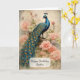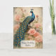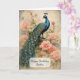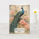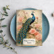 Una elegante ilustración de estilo vintage que presenta un majestuoso pavo real rodeado de flores pastel suaves y delicados detalles botánicos. El fondo antiguo atenuado y los ricos colores de las plumas crean una composición decorativa atemporal inspirada en el arte botánico clásico.