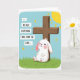 The front design shows a plump white bunny with soft rounded shapes, pink blush on its cheeks, and pale pink inside its ears, resting with eyes closed against a rustic brown wooden cross 🐰. The bunny’s relaxed pose and slight smile suggest a tender, trusting closeness, as if leaning into a steady companion. On the left side, three stacked white rectangles hold uppercase text that reads “...BECAUSE EVERYTHING COMES FROM THE LORD...,” set in dark lettering for strong contrast. The cross stands tall near the center-right, its wood grain hinted with simple shading and slightly uneven edges. Below, a green grassy foreground stretches across the bottom, adding a gentle outdoor setting. Above, a clear blue sky fills most of the background, keeping the scene open and calm. In the upper right corner, a partial yellow sun peeks in with small triangular rays, and a tiny 🌷 sits near the grass line.