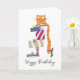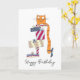 Tarjeta Pelirroja divertida sentada en una pila de regalos