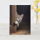 Tarjeta Pensando en ti gatito mirando alrededor de una pue