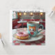 Saluda a un amigo o miembro de la familia con esta tarjeta dulce con una parte posterior que es una página de color. En la parte delantera hay un asador de fresa con espolvorines y una taza de café con un gato Kawaii sobre una mesa en la cena.