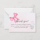 A thank-you card showing a pink watercolor bow and soft pastel baby elements, designed to thank guests for attending a baby shower for a baby girl.