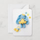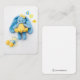 A light and cheerful flat note card featuring a blue crochet bunny in a soft yellow dress, styled with yarn details and small decorative accents.