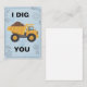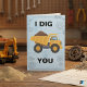 Envía una carga de amor con esta tarjeta de felicitación "Te Cavo" llena de juegos de palabras! Con una encantadora ilustración de un volquete amarillo desbordando de tierra sobre un fondo de plano y engranajes, esta tarjeta es la forma perfecta de mostrar a alguien especial cuánto te importa. Es una opción ideal para el Día de San Valentín, un aniversario, un cumpleaños o simplemente porque sí. El diseño juguetón y el juego de palabras sobre construcción hacen que sea un éxito entre niños, entusiastas de la construcción y cualquiera con sentido del humor. El interior está en blanco para tu mensaje personal. Viene con un sobre blanco a juego.