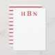 Timeless and elegant custom flat note card design features red letters that can be personalized with the first, last, and middle name initials in classic serif type. Space for your handwritten note is included and the back of the card features a handsome pattern of horizontal red and white stripes.